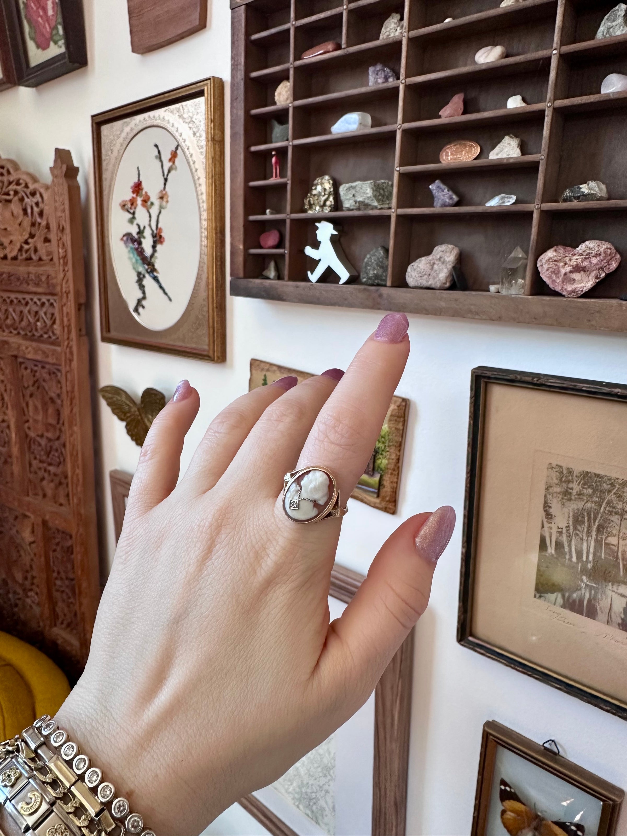 10K Cameo Ring - Wearing a Diamond Necklace - Size 7